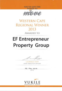 The 2013 Western Cape regional winner of Vukile’s Power to Move programme is Ronnie Derbyshire of EF Entrepreneur Property Group. Ronnie is a founding partner of the firm, which was established in 1994. EF Entrepreneur Property Group received this award for a 10 year industrial transaction of 7710m² with a capital value of R40.8M